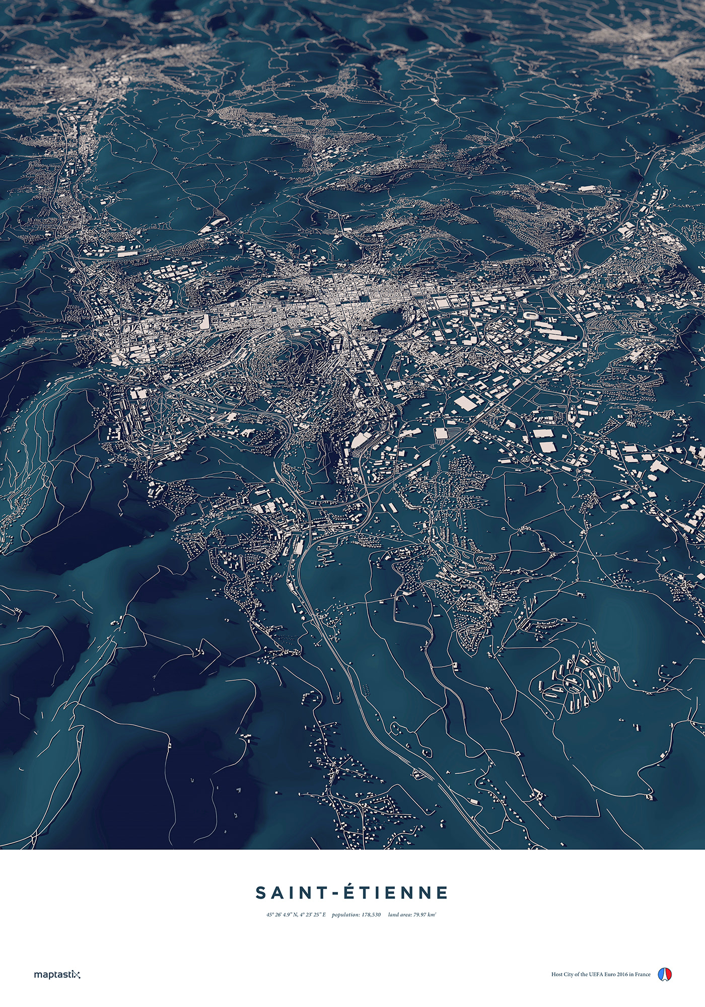 In regard to the upcoming European Football Championship in France, I’ve created a special poster series with unique three-dimensional city maps of all hosting cities of the UEFA Euro 2016.